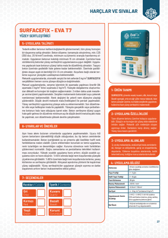 27HAR%u00c7LAR VE SIVALARSURFACEFIX, %u00e7imento esasl%u0131, kuvars, silis, korunt veya Bazalt agregal%u0131, orta ve a%u011f%u0131r y%u00fcke maruz kalacak, taze beton y%u00fczeyler %u00fczerine, toz halde serpilerek uygulanan, kullan%u0131ma haz%u0131r y%u00fczey sertle%u015ftirici malzemedir.Taze d%u00f6%u015feme betonu %u00fczerine kolayca uygulanabilir. D%u00fczg%u00fcn ve homojen bir y%u00fczey elde edebilme imk%u00e2n%u0131 sa%u011flar. Mekanik y%u00fck nedeniyle olu%u015fan a%u015f%u0131nmay%u0131 %u00f6nler. Darbelere kar%u015f%u0131 diren%u00e7 sa%u011flar. Y%u00fczey tozumas%u0131n%u0131 geciktirir. %u0130%u00e7 ve d%u0131%u015f mekanlarda, end%u00fcstriyel tesis zeminlerinde, Hangar ve at%u00f6lyelerde, garaj ve otoparklarda, depolarda, Y%u00fckleme bo%u015faltma alanlar%u0131nda, lastik tekerlekli ara%u00e7 trafi%u011fine maruz alanlarda kullan%u0131l%u0131r.1- %u00dcR%u00dcN TANIMI2- UYGULAMA %u00d6ZELL%u0130KLER%u01303- UYGULAMA ALANLARIK%u00fcrlenme: Ortam s%u0131cakl%u0131%u011f%u0131 ve beton %u00f6zelliklerine g%u00f6re de%u011fi%u015fkenYaya Trafi%u011fi: 1 %u2013 2 g%u00fcnHafif Ta%u015f%u0131t Trafi%u011fi: 7 %u2013 10 g%u00fcnTam K%u00fcrlenme: 28 g%u00fcnBas%u0131n%u00e7 Mukavemeti: >50 N / mm2A%u015f%u0131nma Mukavemeti: <5.5cm3 / 50cm2Sarfiyat: 4 %u2013 9 kg /m2 (ortalama 5 kg/m2)Uygulanacak Zemin S%u0131cakl%u0131%u011f%u0131: (+50C) %u2013 (+350C) %40-50 azalma(C25 s%u0131n%u0131f%u0131 beton %u00fczerine, y%u00fczey sertle%u015ftirici uygulanm%u0131%u015f betona g%u00f6re)Raf %u00d6mr%u00fc: Orijinal ambalaj%u0131nda ve rutubetsiz ortamda 12 ay depolanabilir. 4- UYGULAMA B%u0130LG%u0130S%u0130 5- UYGULAMA TAL%u0130MATISURFACEFIX - EVA T7Y%u00dcZEY SERTLE%u015eT%u0130R%u0130C%u0130Tedarik edilen betonun kalitesi de%u011fi%u015fkenlik g%u00f6stermemeli, t%u00fcm y%u00fczey homojen bir dayan%u0131ma sahip olmal%u0131d%u0131r. Beton d%u00f6%u015feme; tamam%u0131yla s%u0131k%u0131%u015ft%u0131r%u0131lm%u0131%u015f, min. C25 (350 doz, 25 N/mm%u00b2) s%u0131n%u0131f%u0131nda, minimum su/%u00e7imento oran%u0131yla haz%u0131rlanm%u0131%u015f olmal%u0131d%u0131r. Uygulanan betonun kal%u0131nl%u0131%u011f%u0131 minimum 15 cm olmal%u0131d%u0131r. %u0130%u00e7erisine hava s%u00fcr%u00fcklenmi%u015f betonlar y%u00fczey sertle%u015ftirici uygulamas%u0131na uygun de%u011fildir. Uygulama yap%u0131lacak taze betonun y%u00fczeyi tahta mala ile d%u00fczeltilmi%u015f olmal%u0131d%u0131r. Ta%u015f%u0131y%u0131c%u0131 beton %u00fczerinde gezilebilir hale gelene kadar beklenmelidir. %u00dczerinde gezildi%u011finde olu%u015fan ayak izi derinli%u011fi 0.5-1.5 cm olmal%u0131d%u0131r. Ko%u015fullara ba%u011fl%u0131 olarak terleme suyunun y%u00fczeyden uzakla%u015fmas%u0131 beklenmelidir.Mekanik uygulamalarda, otomatik serpici ile tek seferde 5 kg/m%u00b2 SURFACEFIX serpildikten hemen sonra y%u00fczeye d%u00fczg%u00fcnce da%u011f%u0131t%u0131lmal%u0131d%u0131r.Manuel uygulamalarda, serpme i%u015fleminin iki a%u015famada yap%u0131lmas%u0131 %u00f6nerilir (ilk a%u015famada 3 kg/m%u00b2 ikinci a%u015famada 2 kg/m%u00b2). Y%u00fczeyde dalgalanma olu%u015fturmadan dikkatli ve homojen bir da%u011f%u0131l%u0131m sa%u011flanmal%u0131d%u0131r. 2 m%u2019den daha uzak mesafeye serme i%u015flemi yap%u0131lmamal%u0131d%u0131r. Serpilen malzemenin betondaki suyu %u00e7ekerek nemlenmesi beklenmelidir. Renk de%u011fi%u015fimi ile yeterli nem d%u00fczeyine ula%u015ft%u0131%u011f%u0131 g%u00f6zlenebilir. D%u00fc%u015f%u00fck devirli mekanik mala (helikopter) ile perdah yap%u0131lmal%u0131d%u0131r. Y%u00fczey sertle%u015ftirici uygulanm%u0131%u015f y%u00fczeye asla su eklenmemelidir. Son d%u00fczeltmeler elle veya helikopter mala ile yap%u0131labilir. Y%u00fczeyde gev%u015feklik veya %u015ferbetlenme betonun hala taze oldu%u011funa i%u015faret eder. Beton sertle%u015fme d%u00fczeyi uygun hale gelir gelmez %u00f6n d%u00fczeltme minimum a%u00e7%u0131 ile d%u00fc%u015f%u00fck devirli metal b%u0131%u00e7akl%u0131 mala ile yap%u0131lmal%u0131, son d%u00fczeltmede y%u00fcksek devirle %u00e7al%u0131%u015f%u0131lmal%u0131d%u0131r.A%u015f%u0131r%u0131 hava ak%u0131m%u0131 bulunan ortamlarda uygulama yap%u0131lmamal%u0131d%u0131r. U%u00e7ucu k%u00fcl i%u00e7eren betonlar%u0131n i%u015flenebilirli%u011fi d%u00fc%u015f%u00fck oldu%u011fundan, bu tip beton zeminlerde kullan%u0131lmamal%u0131d%u0131r. Beton i%u00e7eri%u011findeki su ve %u00e7imento gibi %u00f6zellikler hafif renk farkl%u0131l%u0131klar%u0131na neden olabilir. %u00c7evre etkilerinden korumak ve temiz uygulama, renk tutarl%u0131l%u0131%u011f%u0131n%u0131 ve devaml%u0131l%u0131%u011f%u0131n%u0131 sa%u011flar. Kuruma s%u00fcresince renk farkl%u0131l%u0131klar%u0131 g%u00f6zlenmesi normaldir. Do%u011fru zamanlama ve perdahlama teknikleri kullan%u0131lmas%u0131 zorunludur. Y%u00fcksek s%u0131cakl%u0131k uygulama h%u0131z%u0131n%u0131 artt%u0131r%u0131r, d%u00fc%u015f%u00fck s%u0131cakl%u0131k uygulama s%u00fcre ve h%u0131z%u0131n%u0131 d%u00fc%u015f%u00fcr%u00fcr. %40%u2019%u0131n alt%u0131nda ba%u011f%u0131l nem ko%u015fullar%u0131nda y%u00fczeyde %u00e7i%u00e7eklenme g%u00f6r%u00fclebilir. %80%u2019in %u00fczerinde ba%u011f%u0131l nem ko%u015fullar%u0131nda terleme, yava%u015f k%u00fcrlenme ve sertle%u015fme g%u00f6r%u00fclebilir. Kimyasal a%u015f%u0131nd%u0131rma y%u00f6ntemi ile kayd%u0131rmaz y%u00fczey sa%u011flanabilir. Y%u00fczey sertle%u015ftiriciler uygulanan y%u00fczeyin a%u015f%u0131nma ve darbe dayan%u0131m%u0131n%u0131 artt%u0131r%u0131r beton mukavemetine etkisi yoktur. 6- UYARILAR VE %u00d6NER%u0130LER 7- SE%u00c7ENEKLER