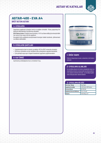 35Polimer dispersiyon esasl%u0131, solventsiz, br%u00fct beton astar%u0131d%u0131rSu emicili%u011fi y%u00fcksek br%u00fct beton y%u00fczeylerde duvar ve tavanlarda, %u00e7imento ve al%u00e7%u0131 esasl%u0131 s%u0131va alt%u0131na aderans%u0131 ve %u00e7al%u0131%u015fma s%u00fcresini art%u0131rmak, su emicili%u011fi engellemek amac%u0131yla astar olarak kullan%u0131l%u0131r.1- %u00dcR%u00dcN TANIMI2- UYGULAMA ALANLARI 3- UYGULAMA B%u0130LG%u0130S%u0130ASTAR-400 - EVA A4BR%u00dcT BETON ASTARIASTAR VE KATKILAR 4- UYGULAMA 5- UYGULAMA %u015eARTLARI 6- RAF %u00d6MR%u00dcUygulama yap%u0131lacak y%u00fczeyler temiz ve sa%u011flam olmal%u0131d%u0131r. Y%u00fczey yap%u0131%u015fmay%u0131 %u00f6nleyecek kal%u0131nt%u0131lardan ar%u0131nd%u0131r%u0131lm%u0131%u015f olmal%u0131d%u0131r. Br%u00fct Beton Astar%u0131 12 kg%u2019l%u0131k kova i%u00e7erisine, 4-6 lt su ilave edilip iyice kar%u0131%u015ft%u0131r%u0131ld%u0131ktan sonra f%u0131r%u00e7a veya rulo ile uygulan%u0131r.Kovadaki %u00fcr%u00fcn aral%u0131klarla kar%u0131%u015ft%u0131r%u0131larak homojen halde tutulmal%u0131, %u00e7%u00f6kmemesine dikkat edilmelidir.A%u00e7%u0131lmam%u0131%u015f ambalaj%u0131nda kuru ortamda 12 ay.%u00dcr%u00fcn Tipi / Rengi: S%u0131v%u0131/Ye%u015filUygulama S%u0131cakl%u0131%u011f%u0131: (+50C) ile (+350C) aras%u0131Kuruma S%u00fcresi: 60-120 dk.Uygulama Sonras%u0131 Bekleme: Min. 24 saatT%u00fcketim: 150-250 gr /m2%u2022Uygulanacak ortam ve zemin s%u0131cakl%u0131%u011f%u0131 +50C ile 350C aras%u0131nda olmal%u0131d%u0131r.%u2022Donmu%u015f, erimekte ve don tehlikesi olan y%u00fczeylerde uygulanmamal%u0131d%u0131r.%u2022%u00c7ok g%u00fcne%u015fli veya a%u015f%u0131r%u0131 r%u00fczgarl%u0131 havalarda uygulama yap%u0131lmamal%u0131d%u0131r.