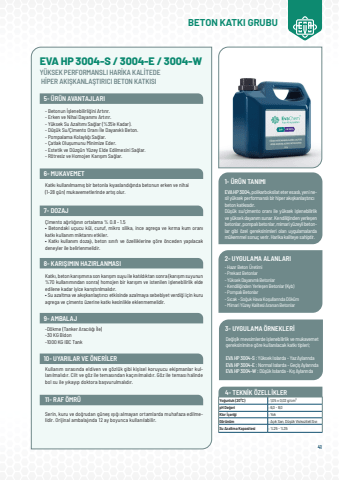 41EVA HP 3004-S / 3004-E / 3004-WY%u00dcKSEK PERFORMANSLI HAR%u0130KA KAL%u0130TEDE H%u0130PER AKI%u015eKANLA%u015eTIRICI BETON KATKISIBETON KATKI GRUBU 5- %u00dcR%u00dcN AVANTAJLARI 6- MUKAVEMET 7- DOZAJ 8- KARI%u015eIMIN HAZIRLANMASI 9- AMBALAJ 10- UYARILAR VE %u00d6NER%u0130LER 11- RAF %u00d6MR%u00dc- Betonun %u0130%u015flenebilirli%u011fini Art%u0131r%u0131r.- Erken ve Nihai Dayan%u0131m%u0131 Art%u0131r%u0131r.- Y%u00fcksek Su Azalt%u0131m%u0131 Sa%u011flar (%35%u2019e Kadar).- D%u00fc%u015f%u00fck Su/%u00c7imento Oran%u0131 %u0130le Dayan%u0131kl%u0131 Beton.- Pompalama Kolayl%u0131%u011f%u0131 Sa%u011flar.- %u00c7atlak Olu%u015fumunu Minimize Eder.- Estetik ve D%u00fczg%u00fcn Y%u00fczey Elde Edilmesini Sa%u011flar.- R%u00f6tresiz ve Homojen Kar%u0131%u015f%u0131m Sa%u011flar.Katk%u0131 kullan%u0131lmam%u0131%u015f bir betonla k%u0131yasland%u0131%u011f%u0131nda betonun erken ve nihai(1-28 g%u00fcn) mukavemetlerinde%u00a0art%u0131%u015f%u00a0olur.%u00c7imento a%u011f%u0131rl%u0131%u011f%u0131n%u0131n ortalama % 0.8 - 1.5%u2022 Betondaki u%u00e7ucu k%u00fcl, curuf, mikro silika, ince agrega ve k%u0131rma kum oran%u0131 katk%u0131 kullan%u0131m miktar%u0131n%u0131 etkiler.%u2022 Katk%u0131 kullan%u0131m dozaj%u0131, beton s%u0131n%u0131f%u0131 ve %u00f6zelliklerine g%u00f6re %u00f6nceden yap%u0131lacak deneyler ile belirlenmelidir.Serin, kuru ve do%u011frudan g%u00fcne%u015f %u0131%u015f%u0131%u011f%u0131 almayan ortamlarda muhafaza edilmelidir. Orijinal ambalaj%u0131nda 12 ay boyunca kullan%u0131labilir.Katk%u0131, beton kar%u0131%u015f%u0131m%u0131na son kar%u0131%u015f%u0131m suyu ile kat%u0131ld%u0131ktan sonra (kar%u0131%u015f%u0131m suyunun %70 kullan%u0131m%u0131ndan sonra) homojen bir kar%u0131%u015f%u0131m ve istenilen i%u015flenebilirlik elde edilene kadar iyice kar%u0131%u015ft%u0131r%u0131lmal%u0131d%u0131r.%u2022 Su azaltma ve ak%u0131%u015fkanla%u015ft%u0131r%u0131c%u0131 etkisinde azalmaya sebebiyet verdi%u011fi i%u00e7in kuru agrega ve %u00e7imento %u00fczerine katk%u0131 kesinlikle%u00a0eklenmemelidir.-D%u00f6kme (Tanker Arac%u0131l%u0131%u011f%u0131 %u0130le)-30 KG Bidon-1000 KG IBC TankKullan%u0131m s%u0131ras%u0131nda eldiven ve g%u00f6zl%u00fck gibi ki%u015fisel koruyucu ekipmanlar kullan%u0131lmal%u0131d%u0131r. Cilt ve g%u00f6z ile temas%u0131ndan ka%u00e7%u0131n%u0131lmal%u0131d%u0131r. G%u00f6z ile temas%u0131 halinde bol su ile y%u0131kay%u0131p doktora ba%u015fvurulmal%u0131d%u0131r. EVA HP 3004, polikarboksilat eter esasl%u0131, yeni nesil y%u00fcksek performansl%u0131 bir hiper ak%u0131%u015fkanla%u015ft%u0131r%u0131c%u0131 beton katk%u0131s%u0131d%u0131r.D%u00fc%u015f%u00fck su/%u00e7imento oran%u0131 ile y%u00fcksek i%u015flenebilirlik ve y%u00fcksek dayan%u0131m sunar. Kendili%u011finden yerle%u015fen betonlar, pompal%u0131 betonlar, mimari y%u00fczeyli betonlar gibi %u00f6zel gereksinimleri olan uygulamalarda m%u00fckemmel sonu%u00e7 verir. Harika kaliteye sahiptir.- Haz%u0131r Beton %u00dcretimi - Prekast Betonlar- Y%u00fcksek Dayan%u0131ml%u0131 Betonlar - Kendili%u011finden Yerle%u015fen Betonlar (Kyb)- Pompal%u0131 Betonlar - S%u0131cak - So%u011fuk Hava Ko%u015fullar%u0131nda D%u00f6k%u00fcm- Mimari Y%u00fczey Kalitesi Aranan BetonlarDe%u011fi%u015fik mevsimlerde i%u015flenebilirlik ve mukavemet gereksinimine g%u00f6re kullan%u0131lacak katk%u0131 tipleri;EVA HP 3004-S : Y%u00fcksek Is%u0131larda - Yaz Aylar%u0131ndaEVA HP 3004-E : Normal Is%u0131larda - Ge%u00e7i%u015f Aylar%u0131ndaEVA HP 3004-W : D%u00fc%u015f%u00fck Is%u0131larda - K%u0131%u015f Aylar%u0131nda1- %u00dcR%u00dcN TANIMI2- UYGULAMA ALANLARI3- UYGULAMA %u00d6RNEKLER%u0130Yo%u011funluk (20%u00b0C): 1,05 %u00b1 0,02 g/cm%u00b3 pH De%u011feri: 6,0 - 8,0Klor %u0130%u00e7eri%u011fi: YokG%u00f6r%u00fcn%u00fcm: A%u00e7%u0131k Sar%u0131, D%u00fc%u015f%u00fck Viskoziteli S%u0131v%u0131Su Azaltma Kapasitesi: %25 - %35 4- TEKN%u0130K %u00d6ZELL%u0130KLER