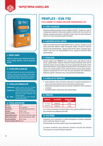 12YAPI%u015eTIRMA HAR%u00c7LARI 5- Y%u00dcZEY HAZIRLI%u011eI 6- KARI%u015eIMIN HAZIRLANMASI 7- UYGULAMA 8- UYARILAR VE %u00d6NER%u0130LER 9- T%u00dcKET%u0130M 10- RAF %u00d6MR%u00dcPROFLEX - EVA Y32PROFLEX, %u00e7imento esasl%u0131, y%u00fcksek performansl%u0131, kayma %u00f6zelli%u011fi azalt%u0131lm%u0131%u015f, seramik yap%u0131%u015ft%u0131rma harc%u0131d%u0131r.Orta ve b%u00fcy%u00fck ebatl%u0131 yer ve duvar serami%u011fi, do%u011fal ta%u015f, traverten, mermer, granit, porselen seramik, dekoratif tu%u011fla gibi kaplama malzemelerinin i%u00e7 ve d%u0131%u015f mek%u00e2nlarda, yatay ve d%u00fc%u015fey uygulamalar%u0131nda kullan%u0131l%u0131r.%u0130%u00e7 Mek%u00e2n Duvar :%u0130%u00e7 Mek%u00e2n Zemin :D%u0131%u015f Mek%u00e2n :%u00c7imento esasl%u0131 s%u0131va, al%u00e7%u0131 ve beton d%u00f6%u015femeler, eski seramik kaplama%u00c7imento esasl%u0131 %u015fap y%u00fczeyler (y%u00fczeyin yeterince prizini almas%u0131 ve kuru olas%u0131 ko%u015fulu ile) ve beton d%u00f6%u015femeler, eski seramik kaplama%u00c7imento esasl%u0131 %u015fap ve beton d%u00f6%u015feme, eski seramik kaplama1- %u00dcR%u00dcN TANIMI2- UYGULAMA ALANLARI3- UYGULAMA %u00d6RNEKLER%u0130FLEX-GRAN%u0130T VE PORSELEN KARO YAPI%u015eTIRICISI-C2TUygulama yap%u0131lacak y%u00fczeyler temiz ve sa%u011flam olmal%u0131d%u0131r. Y%u00fczeyde toz, ya%u011f, kir ve yap%u0131%u015fmay%u0131 engelleyici malzemeler y%u00fczeyden temizlenmeli, har%u00e7 %u00e7imento vb. kal%u0131nt%u0131lar y%u00fczeyden kaz%u0131nmal%u0131d%u0131r. Derinli%u011fi 2 cm%u2019den fazla olan y%u00fczey hatalar%u0131n%u0131n tamiri en az 1 g%u00fcn %u00f6ncesinden yap%u0131lm%u0131%u015f olmal%u0131d%u0131r.Temiz ve yuvarlak formlu bir kaba 6-6.5 lt temiz su konulur, 25 kg'l%u0131k toz %u00fcr%u00fcn yava%u015f yava%u015f ilave edilerek, topak kalmayacak %u015fekilde, homojen bir g%u00f6r%u00fcnt%u00fc oluncaya dek kar%u0131%u015ft%u0131r%u0131lmal%u0131d%u0131r. Kar%u0131%u015f%u0131m d%u00fc%u015f%u00fck devirli mikser yard%u0131m%u0131yla yap%u0131lmal%u0131d%u0131r. Taze har%u00e7 5 dk. dinlendirildikten sonra, uygulama %u00f6ncesinde tekrar kar%u0131%u015ft%u0131r%u0131lmal%u0131d%u0131r.Kar%u0131%u015f%u0131m%u0131 yap%u0131lm%u0131%u015f olan PROFLEX harc%u0131, ebad%u0131na uygun %u00e7elik di%u015fili bir mala ile y%u00fczeye uygulanmal%u0131d%u0131r. Kaplama malzemesi y%u00fczeye yerle%u015ftirilip, lastik u%u00e7lu bir tokmak ile y%u00fczeye oturmas%u0131 sa%u011flan%u0131r. D%u0131%u015f ortam uygulamalar%u0131nda 40x40 cm%u2019den b%u00fcy%u00fck ebatl%u0131 karolar%u0131n y%u00fczeye yap%u0131%u015ft%u0131r%u0131lmas%u0131nda karonun alt bo%u015fluklar%u0131na da yap%u0131%u015ft%u0131r%u0131c%u0131 har%u00e7 doldurulmal%u0131d%u0131r. 20 dk. i%u00e7erisinde karolar y%u00fczeye yap%u0131%u015ft%u0131r%u0131lmal%u0131d%u0131r. Uygulama a%u015famas%u0131nda her 50 m%u00b2 alan i%u00e7in geni%u015f genle%u015fme derz aral%u0131klar%u0131n%u0131n b%u0131rak%u0131lmas%u0131 gerekir. Haz%u0131rlanan har%u00e7 3 saat i%u00e7erisinde t%u00fcketilmelidir.Rutubetsiz, kuru ortamlarda ve orijinal ambalaj%u0131nda muhafaza edildi%u011finde %u00fcretim tarihinden itibaren 12 ayd%u0131r.Kullan%u0131lmad%u0131%u011f%u0131 durumlarda paketin a%u011fz%u0131 s%u0131k%u0131ca kapat%u0131lmal%u0131d%u0131r. %u2022A%u00e7%u0131kta bekleme s%u00fcresi i%u00e7erisinde malzemenin y%u00fczeyinde kabukla%u015fma olmas%u0131 durumunda malzeme tekrar kar%u0131%u015ft%u0131r%u0131larak uygulanmal%u0131d%u0131r.%u2022Malzemede kabukla%u015fma olmas%u0131 durumunda malzemenin tekrar %u0131slat%u0131lmas%u0131 %u00f6nerilmez.%u2022Kesinlikle yabanc%u0131 malzemeler ilave edilmemelidir.UygulamaTarak %u00d6l%u00e7%u00fcs%u00fcT%u00fcketim Miktar%u0131(Kg/m2)Tek Tarafl%u0131Yap%u0131%u015ft%u0131rma6x6x6 mm3-4 kg8x8x8 mm4-5 kg%u00dcr%u00fcn Tipi: Toz%u00dcr%u00fcn Rengi: Gri veya BeyazKar%u0131%u015f%u0131m Oran%u0131: 25 kg%u2019l%u0131k kar%u0131%u015f%u0131m i%u00e7in 6-6.5 lt suKap %u00d6mr%u00fc: Maks. 3 saatUygulama S%u0131cakl%u0131%u011f%u0131: +50C ile +350C aras%u0131A%u00e7%u0131kta Bekletme S%u00fcresi : 20 dakika (TS EN 12004-1%u2019e g%u00f6re)Kullan%u0131ma Alma S%u00fcresi: Min.24 saat (hafif yaya trafi%u011fi)Derz i%u00e7in Gerekli S%u00fcre: Min. 24 saat Tamamen Sertle%u015fme S%u00fcresi: 28 g%u00fcnBu de%u011ferler standartlara uygun laboratuvar deneyleri sonucunda elde edilmi%u015ftir. Farkl%u0131 uygulama ortamlar%u0131nda de%u011ferler de%u011fi%u015febilir.Not: Verilen sarfiyat de%u011ferleri yakla%u015f%u0131k de%u011ferler olup, uygulama y%u00fczeyin alan%u0131 ve uygulama kal%u0131nl%u0131%u011f%u0131na g%u00f6re de%u011fi%u015fiklik g%u00f6sterebilir. 4- UYGULAMA B%u0130LG%u0130S%u0130
