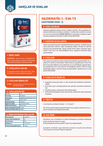 24HAR%u00c7LAR VE SIVALAR 6- Y%u00dcZEY HAZIRLI%u011eI 7- KARI%u015eIMIN HAZIRLANMASI 8- UYGULAMA 9- UYARILAR VE %u00d6NER%u0130LER 9- T%u00dcKET%u0130M 10- RAF %u00d6MR%u00dcHAZIRMAT%u0130K-1 - EVA T3HAZIRMAT%u0130K-1, %u00e7imento esasl%u0131, i%u00e7 mekanlarda kullan%u0131lan, y%u00fcksek yap%u0131%u015fma ve dayan%u0131m mukavemetine sahip makina ile uygulanan katk%u0131l%u0131 kaba s%u0131vad%u0131r.%u0130%u00e7 mekanlarda beton, tu%u011fla, br%u00fct beton, bims, briket beton ve tavan y%u00fczeylerde uygulan%u0131r.%u0130%u00e7 Mek%u00e2n : %u00c7imento esasl%u0131 s%u0131va, br%u00fct beton, briket ve tu%u011fla gibi y%u00fczeylerde1- %u00dcR%u00dcN TANIMI2- UYGULAMA ALANLARI3- UYGULAMA %u00d6RNEKLER%u0130HAZIR MAK%u0130NE SIVASI - %u0130%u00c7Uygulama yap%u0131lacak y%u00fczeyler temiz ve sa%u011flam olmal%u0131d%u0131r. Y%u00fczey yap%u0131%u015fmay%u0131 %u00f6nleyecek kal%u0131nt%u0131lardan ar%u0131nd%u0131r%u0131lm%u0131%u015f olmal%u0131d%u0131r. 3 mm%u2019den derin %u00e7atlak ve kusurlar en az 24 saat %u00f6ncesinden REPAIR MASTER ile onar%u0131lmal%u0131d%u0131r. Uygulama yap%u0131lacak y%u00fczey uygulama %u00f6ncesinde mutlaka nemlendirilmelidir.Temiz ve yuvarlak formlu bir kaba 6.5-7.5 lt temiz su konulur, 35 kg'l%u0131k toz %u00fcr%u00fcn yava%u015f yava%u015f ilave edilerek, topak kalmayacak %u015fekilde, homojen bir g%u00f6r%u00fcnt%u00fc oluncaya dek kar%u0131%u015ft%u0131r%u0131lmal%u0131d%u0131r. Kar%u0131%u015f%u0131m d%u00fc%u015f%u00fck devirli mikser yard%u0131m%u0131yla yap%u0131lmal%u0131d%u0131r. Taze har%u00e7 5 dk. dinlendirildikten sonra, uygulama %u00f6ncesinde tekrar kar%u0131%u015ft%u0131r%u0131lmal%u0131d%u0131r.%u00dcr%u00fcn uygun s%u0131va makinas%u0131 yard%u0131m%u0131 ile y%u00fczey e%u015fit kal%u0131nl%u0131kta uygulanmal%u0131d%u0131r. %u0130lk uygulama 10 mm'den az olmamal%u0131d%u0131r. Birden fazla kat uygulanacak ise ikinci kat, birinci kat prizini ald%u0131ktan sonra maksimum 2.5 cm kal%u0131nl%u0131%u011f%u0131nda uygulanmal%u0131d%u0131r. Bu uygulamadan sonra s%u0131va yeterince sertle%u015fti%u011finde, perdah malas%u0131 ile y%u00fczey d%u00fczg%u00fcnl%u00fc%u011f%u00fc sa%u011flan%u0131r, nemli bir s%u00fcnger ile y%u00fczey bitirilir. Haz%u0131rlanan har%u00e7 2 saat i%u00e7inde t%u00fcketilmelidir.Rutubetsiz, kuru ortamlarda ve orijinal ambalaj%u0131nda muhafaza edildi%u011finde %u00fcretim tarihinden itibaren 12 ayd%u0131r.Kullan%u0131lmad%u0131%u011f%u0131 durumlarda paketin a%u011fz%u0131 s%u0131k%u0131ca kapat%u0131lmal%u0131d%u0131r. %u00dcr%u00fcn Tipi: Toz%u00dcr%u00fcn Rengi: Gri, BeyazKar%u0131%u015f%u0131m Oran%u0131: 35 kg%u2019l%u0131k toz kar%u0131%u015f%u0131m i%u00e7in 6.5-7.5 lt suKap %u00d6mr%u00fc: Maks. 2 saatUygulama Kal%u0131nl%u0131%u011f%u0131: 5-30 mmUygulama S%u0131cakl%u0131%u011f%u0131: +50C ile +300C aras%u0131Kullan%u0131ma Alma S%u00fcresi: Min.24 saatKatlar Aras%u0131 Bekleme S%u00fcresi: 24 saat Tamamen Sertle%u015fme S%u00fcresi: 28 g%u00fcnBas%u0131n%u00e7 Dayan%u0131m%u0131: %u22656 N/mm2Yang%u0131na Tepki S%u0131n%u0131fland%u0131rmas%u0131: A1K%u0131lcal Su Emme : W0Ba%u011f Dayan%u0131m%u0131: %u22650,2 (FP-B)Su Buhar%u0131 Ge%u00e7irgenli%u011fi Katsay%u0131s%u0131: %u226425 (%u00b5)Bu de%u011ferler standartlara uygun laboratuvar deneyleri sonucunda elde edilmi%u015ftir. Farkl%u0131 uygulama ortamlar%u0131nda de%u011ferler de%u011fi%u015febilir.Not: Verilen sarfiyat de%u011ferleri yakla%u015f%u0131k de%u011ferler olup, uygulama y%u00fczeyin alan%u0131 ve uygulama kal%u0131nl%u0131%u011f%u0131na g%u00f6re de%u011fi%u015fiklik g%u00f6sterebilir. 4- UYGULAMA B%u0130LG%u0130S%u0130 5- %u00dcR%u00dcN PERFORMANS %u00d6ZELLIKLERI%u2022Uygulama sonras%u0131nda y%u00fczey 1-2 g%u00fcn s%u00fcreyle belli aral%u0131klarla nemlendirilmelidir.%u2022Br%u00fct beton gibi su emicili%u011fi y%u00fcksek olan y%u00fczeyler %u00f6ncesinde astarlanmal%u0131d%u0131r.%u2022Kesinlikle yabanc%u0131 malzemeler ilave edilmemelidir.%u2022Malzemede kabukla%u015fma olmas%u0131 durumunda malzemenin tekrar %u0131slat%u0131lmas%u0131 %u00f6nerilmez.1 mm kal%u0131nl%u0131k i%u00e7in t%u00fcketim miktar%u0131 ~1.4-1.6 kg/m%u00b2.