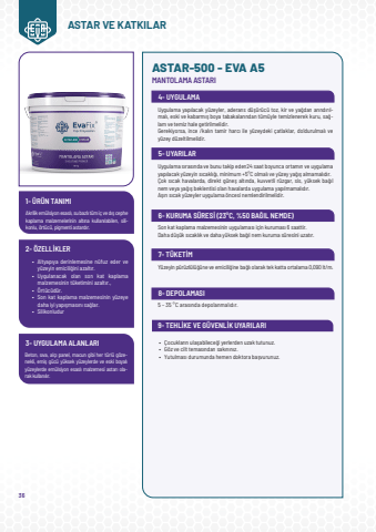 36 4- UYGULAMA 5- UYARILAR 6- KURUMA S%u00dcRES%u0130 (23%u00b0C, %50 BA%u011eIL NEMDE) 7- T%u00dcKET%u0130M 8- DEPOLAMASI 9- TEHL%u0130KE VE G%u00dcVENL%u0130K UYARILARIASTAR VE KATKILARASTAR-500 - EVA A5Akrilik em%u00fclsiyon esasl%u0131, su bazl%u0131 t%u00fcm i%u00e7 ve d%u0131%u015f cephe kaplama malzemelerinin alt%u0131na kullan%u0131labilen, silikonlu, %u00f6rt%u00fcc%u00fc, pigmenti astard%u0131r.Beton, s%u0131va, al%u00e7%u0131 panel, macun gibi her t%u00fcrl%u00fc g%u00f6zenekli, emi%u015f g%u00fcc%u00fc y%u00fcksek y%u00fczeylerde ve eski boyal%u0131 y%u00fczeylerde em%u00fclsiyon esasl%u0131 malzemesi astar%u0131 olarak kullan%u0131l%u0131r.1- %u00dcR%u00dcN TANIMI2- %u00d6ZELL%u0130KLER3- UYGULAMA ALANLARIMANTOLAMA ASTARIUygulama yap%u0131lacak y%u00fczeyler, aderans d%u00fc%u015f%u00fcr%u00fcc%u00fc toz, kir ve ya%u011fdan ar%u0131nd%u0131r%u0131lmal%u0131, eski ve kabarm%u0131%u015f boya tabakalar%u0131ndan t%u00fcm%u00fcyle temizlenerek kuru, sa%u011flam ve temiz hale getirilmelidir.Gerekiyorsa, ince /kal%u0131n tamir harc%u0131 ile y%u00fczeydeki %u00e7atlaklar, doldurulmal%u0131 ve y%u00fczey d%u00fczeltilmelidir.Uygulama s%u0131ras%u0131nda ve bunu takip eden24 saat boyunca ortam%u0131n ve uygulama yap%u0131lacak y%u00fczeyin s%u0131cakl%u0131%u011f%u0131, minimum +5%u00b0C olmal%u0131 ve y%u00fczey ya%u011f%u0131%u015f almamal%u0131d%u0131r.%u00c7ok s%u0131cak havalarda, direkt g%u00fcne%u015f alt%u0131nda, kuvvetli r%u00fczgar, sis, y%u00fcksek ba%u011f%u0131l nem veya ya%u011f%u0131%u015f beklentisi olan havalarda uygulama yap%u0131lmamal%u0131d%u0131r.A%u015f%u0131r%u0131 s%u0131cak y%u00fczeyler uygulama %u00f6ncesi nemlendirilmelidir.Son kat kaplama malzemesinin uygulamas%u0131 i%u00e7in kurumas%u0131 6 saattir.Daha d%u00fc%u015f%u00fck s%u0131cakl%u0131k ve daha y%u00fcksek ba%u011f%u0131l nem kuruma s%u00fcresini uzat%u0131r.Y%u00fczeyin p%u00fcr%u00fczl%u00fcl%u00fc%u011f%u00fcne ve emicili%u011fine ba%u011fl%u0131 olarak tek katta ortalama 0,090 lt/m.5 %u2013 35 %u00b0C aras%u0131nda depolanmal%u0131d%u0131r.%u2022Altyap%u0131ya derinlemesine n%u00fcfuz eder ve y%u00fczeyin emicili%u011fini azalt%u0131r.%u2022Uygulanacak olan son kat kaplama malzemesinin t%u00fcketimini azalt%u0131r.,%u2022%u00d6rt%u00fcc%u00fcd%u00fcr.%u2022Son kat kaplama malzemesinin y%u00fczeye daha iyi yap%u0131%u015fmas%u0131n%u0131 sa%u011flar. %u2022Silikonludur%u2022%u00c7ocuklar%u0131n ula%u015fabilece%u011fi yerlerden uzak tutunuz.%u2022G%u00f6z ve cilt temas%u0131ndan sak%u0131n%u0131n%u0131z.%u2022Yutulmas%u0131 durumunda hemen doktora ba%u015fvurunuz.