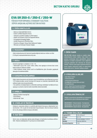 43EVA SR 250-S / 250-E / 250-WY%u00dcKSEK PERFORMANSLI STANDART KAL%u0130TEDE S%u00dcPER AKI%u015eKANLA%u015eTIRICI BETON KATKISIBETON KATKI GRUBU 5- %u00dcR%u00dcN AVANTAJLARI 6- MUKAVEMET 7- DOZAJ 8- KARI%u015eIMIN HAZIRLANMASI 9- AMBALAJ 10- UYARILAR VE %u00d6NER%u0130LER 11- RAF %u00d6MR%u00dc- Betonun %u0130%u015flenebilirli%u011fini Art%u0131r%u0131r.- Erken ve Nihai Dayan%u0131m%u0131 Art%u0131r%u0131r.- Y%u00fcksek Su Azalt%u0131m%u0131 Sa%u011flar (%25%u2019e Kadar).- D%u00fc%u015f%u00fck Su/%u00c7imento Oran%u0131 %u0130le Dayan%u0131kl%u0131 Beton.- Pompalama Kolayl%u0131%u011f%u0131 Sa%u011flar.- %u00c7atlak Olu%u015fumunu Minimize Eder.- Estetik ve D%u00fczg%u00fcn Y%u00fczey Elde Edilmesini Sa%u011flar.- R%u00f6tresiz ve Homojen Kar%u0131%u015f%u0131m Sa%u011flar.Katk%u0131 kullan%u0131lmam%u0131%u015f bir betonla k%u0131yasland%u0131%u011f%u0131nda betonun erken ve nihai(1-28 g%u00fcn) mukavemetlerinde%u00a0art%u0131%u015f%u00a0olur.%u00c7imento a%u011f%u0131rl%u0131%u011f%u0131n%u0131n ortalama % 0.8 - 1.5%u2022 Betondaki u%u00e7ucu k%u00fcl, curuf, mikro silika, ince agrega ve k%u0131rma kum oran%u0131 katk%u0131 kullan%u0131m miktar%u0131n%u0131 etkiler.%u2022 Katk%u0131 kullan%u0131m dozaj%u0131, beton s%u0131n%u0131f%u0131 ve %u00f6zelliklerine g%u00f6re %u00f6nceden yap%u0131lacak deneyler ile belirlenmelidir.Serin, kuru ve do%u011frudan g%u00fcne%u015f %u0131%u015f%u0131%u011f%u0131 almayan ortamlarda muhafaza edilmelidir. Orijinal ambalaj%u0131nda 12 ay boyunca kullan%u0131labilir.Katk%u0131, beton kar%u0131%u015f%u0131m%u0131na son kar%u0131%u015f%u0131m suyu ile kat%u0131ld%u0131ktan sonra (kar%u0131%u015f%u0131m suyunun %70 kullan%u0131m%u0131ndan sonra) homojen bir kar%u0131%u015f%u0131m ve istenilen i%u015flenebilirlik elde edilene kadar iyice kar%u0131%u015ft%u0131r%u0131lmal%u0131d%u0131r.%u2022 Su azaltma ve ak%u0131%u015fkanla%u015ft%u0131r%u0131c%u0131 etkisinde azalmaya sebebiyet verdi%u011fi i%u00e7in kuru agrega ve %u00e7imento %u00fczerine katk%u0131 kesinlikle%u00a0eklenmemelidir.-D%u00f6kme (Tanker Arac%u0131l%u0131%u011f%u0131 %u0130le)-30 KG Bidon-1000 KG IBC TankKullan%u0131m s%u0131ras%u0131nda eldiven ve g%u00f6zl%u00fck gibi ki%u015fisel koruyucu ekipmanlar kullan%u0131lmal%u0131d%u0131r. Cilt ve g%u00f6z ile temas%u0131ndan ka%u00e7%u0131n%u0131lmal%u0131d%u0131r. G%u00f6z ile temas%u0131 halinde bol su ile y%u0131kay%u0131p doktora ba%u015fvurulmal%u0131d%u0131r. EVA SR 250, y%u00fcksek oranda su azalt%u0131c%u0131 s%u00fcper ak%u0131%u015fkanla%u015ft%u0131r%u0131c%u0131 beton katk%u0131s%u0131, haz%u0131r beton ve prekast %u00fcretiminde %u00fcst%u00fcn i%u015flenebilirlik, y%u00fcksek dayan%u0131m ve d%u00fc%u015f%u00fck su/%u00e7imento oran%u0131 sa%u011flamak amac%u0131yla kullan%u0131lan ileri teknoloji bir kimyasal katk%u0131d%u0131r. Polimer esasl%u0131 yap%u0131s%u0131 sayesinde betonun k%u0131vam kayb%u0131n%u0131 minimuma indirir ve erken/nihai dayan%u0131mlar%u0131 art%u0131r%u0131r. Standart kaliteye sahiptir.- Haz%u0131r Beton %u00dcretimi - Prekast Betonlar- Y%u00fcksek Dayan%u0131ml%u0131 Betonlar - Kendili%u011finden Yerle%u015fen Betonlar (Kyb)- Pompal%u0131 Betonlar - S%u0131cak - So%u011fuk Hava Ko%u015fullar%u0131nda D%u00f6k%u00fcm- Mimari Y%u00fczey Kalitesi Aranan BetonlarDe%u011fi%u015fik mevsimlerde i%u015flenebilirlik ve mukavemet gereksinimine g%u00f6re kullan%u0131lacak katk%u0131 tipleri;EVA SR 250-S : Y%u00fcksek Is%u0131larda - Yaz Aylar%u0131ndaEVA SR 250-E : Normal Is%u0131larda - Ge%u00e7i%u015f Aylar%u0131ndaEVA SR 250-W : D%u00fc%u015f%u00fck Is%u0131larda - K%u0131%u015f Aylar%u0131nda1- %u00dcR%u00dcN TANIMI2- UYGULAMA ALANLARI3- UYGULAMA %u00d6RNEKLER%u0130Yo%u011funluk (20%u00b0C): 1,05 %u00b1 0,02 g/cm%u00b3 pH De%u011feri: 6,0 - 8,0Dozaj:%u00c7imento A%u011f%u0131rl%u0131%u011f%u0131n%u0131n %0.8-2.0G%u00f6r%u00fcn%u00fcm: A%u00e7%u0131k Sar%u0131, %u015eeffaf S%u0131v%u0131Su Azaltma Kapasitesi: %25 4- TEKN%u0130K %u00d6ZELL%u0130KLER