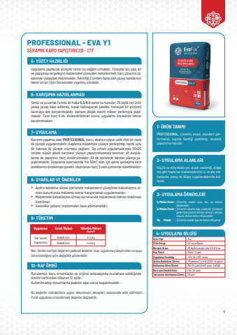 7PROFESSIONAL, %u00e7imento esasl%u0131, standart performansl%u0131, kayma %u00f6zelli%u011fi azalt%u0131lm%u0131%u015f, seramik yap%u0131%u015ft%u0131rma harc%u0131d%u0131r.K%u00fc%u00e7%u00fck ve orta ebatl%u0131 yer, duvar serami%u011fi, do%u011fal ta%u015f gibi kaplama malzemelerinin i%u00e7 ve d%u0131%u015f mekanlarda, yatay ve d%u00fc%u015fey uygulamalar%u0131nda kullan%u0131l%u0131r.%u0130%u00e7 Mek%u00e2n Duvar :%u0130%u00e7 Mek%u00e2n Zemin :D%u0131%u015f Mek%u00e2n :%u00c7imento esasl%u0131 s%u0131va, al%u00e7%u0131 ve beton d%u00f6%u015femeler%u00c7imento esasl%u0131 %u015fap y%u00fczeyler (y%u00fczeyin yeterince prizini almas%u0131 ve kuru olmas%u0131 ko%u015fulu ile) ve beton d%u00f6%u015femeler%u00c7imento esasl%u0131 %u015fap ve beton d%u00f6%u015feme1- %u00dcR%u00dcN TANIMI2- UYGULAMA ALANLARI3- UYGULAMA %u00d6RNEKLER%u0130%u00dcr%u00fcn Tipi: Toz%u00dcr%u00fcn Rengi: Gri veya BeyazKar%u0131%u015f%u0131m Oran%u0131: 25 kg%u2019l%u0131k kar%u0131%u015f%u0131m i%u00e7in 5.5-6 lt suKap %u00d6mr%u00fc: Maks. 3 saatUygulama S%u0131cakl%u0131%u011f%u0131: +50C ile +350C aras%u0131A%u00e7%u0131kta Bekletme S%u00fcresi : 20 dakika (TS EN 12004-1%u2019e g%u00f6re)Kullan%u0131ma Alma S%u00fcresi: Min.24 saat (hafif yaya trafi%u011fi)Derz i%u00e7in Gerekli S%u00fcre: Min. 24 saat Tamamen Sertle%u015fme S%u00fcresi: 28 g%u00fcn 4- UYGULAMA B%u0130LG%u0130S%u0130 5- Y%u00dcZEY HAZIRLI%u011eI 6- KARI%u015eIMIN HAZIRLANMASI 7- UYGULAMA 8- UYARILAR VE %u00d6NER%u0130LER 9- T%u00dcKET%u0130M 10- RAF %u00d6MR%u00dcPROFESSIONAL - EVA Y1SERAM%u0130K KARO YAPI%u015eTIRICISI - C1TUygulama yap%u0131lacak y%u00fczeyler temiz ve sa%u011flam olmal%u0131d%u0131r. Y%u00fczeyde toz, ya%u011f, kir ve yap%u0131%u015fmay%u0131 engelleyici malzemeler y%u00fczeyden temizlenmeli, har%u00e7 %u00e7imento vb. kal%u0131nt%u0131lar y%u00fczeyden kaz%u0131nmal%u0131d%u0131r. Derinli%u011fi 2 cm%u2019den fazla olan y%u00fczey hatalar%u0131n%u0131n tamiri en az 1 g%u00fcn %u00f6ncesinden yap%u0131lm%u0131%u015f olmal%u0131d%u0131r.Temiz ve yuvarlak formlu bir kaba 5.5-6 lt temiz su konulur, 25 kg%u2019l%u0131k toz %u00fcr%u00fcn yava%u015f yava%u015f ilave edilerek, topak kalmayacak %u015fekilde, homojen bir g%u00f6r%u00fcnt%u00fc oluncaya dek kar%u0131%u015ft%u0131r%u0131lmal%u0131d%u0131r. Kar%u0131%u015f%u0131m d%u00fc%u015f%u00fck devirli mikser yard%u0131m%u0131yla yap%u0131lmal%u0131d%u0131r. Taze har%u00e7 5 dk. dinlendirildikten sonra, uygulama %u00f6ncesinde tekrar kar%u0131%u015ft%u0131r%u0131lmal%u0131d%u0131r.Kar%u0131%u015f%u0131m%u0131 yap%u0131lm%u0131%u015f olan PROFESSIONAL harc%u0131, ebat%u0131na uygun %u00e7elik di%u015fli bir mala ile y%u00fczeye uygulanmal%u0131d%u0131r. Kaplama malzemesi y%u00fczeye yerle%u015ftirilip, lastik u%u00e7lu bir tokmak ile y%u00fczeye oturmas%u0131 sa%u011flan%u0131r. D%u0131%u015f ortam uygulamalar%u0131nda 20x20 cm%u2019den b%u00fcy%u00fck abatl%u0131 karolar%u0131n y%u00fczeye yap%u0131%u015ft%u0131r%u0131lmas%u0131nda karonun alt bo%u015fluklar%u0131na da yap%u0131%u015ft%u0131r%u0131c%u0131 har%u00e7 doldurulmal%u0131d%u0131r. 20 dk i%u00e7erisinde karolar y%u00fczeye yap%u0131%u015ft%u0131r%u0131lmal%u0131d%u0131r. Uygulama a%u015famas%u0131nda her 50m%u00b2 alan i%u00e7in geni%u015f genle%u015fme derz aral%u0131klar%u0131n%u0131n b%u0131rak%u0131lmas%u0131 gerekir. Haz%u0131rlanan har%u00e7 3 saat i%u00e7erisinde t%u00fcketilmelidir.Rutubetsiz, kuru ortamlarda ve orijinal ambalaj%u0131nda muhafaza edildi%u011finde %u00fcretim tarihinden itibaren 12 ayd%u0131r.Kullan%u0131lmad%u0131%u011f%u0131 durumlarda paketin a%u011fz%u0131 s%u0131k%u0131ca kapat%u0131lmal%u0131d%u0131r. %u2022A%u00e7%u0131kta bekleme s%u00fcresi i%u00e7erisinde malzemenin y%u00fczeyinde kabukla%u015fma olmas%u0131 durumunda malzeme tekrar kar%u0131%u015ft%u0131r%u0131larak uygulanmal%u0131d%u0131r.%u2022Malzemede kabukla%u015fma olmas%u0131 durumunda malzemenin tekrar %u0131slat%u0131lmas%u0131 %u00f6nerilmez.%u2022Kesinlikle yabanc%u0131 malzemeler ilave edilmemelidir.UygulamaTarak %u00d6l%u00e7%u00fcs%u00fcT%u00fcketim Miktar%u0131(Kg/m2)Tek Tarafl%u0131Yap%u0131%u015ft%u0131rma6x6x6 mm3-4 kg8x8x8 mm4-5 kgBu de%u011ferler standartlara uygun laboratuvar deneyleri sonucunda elde edilmi%u015ftir. Farkl%u0131 uygulama ortamlar%u0131nda de%u011ferler de%u011fi%u015febilir.Not: Verilen sarfiyat de%u011ferleri yakla%u015f%u0131k de%u011ferler olup, uygulama y%u00fczeyin alan%u0131 ve uygulama kal%u0131nl%u0131%u011f%u0131na g%u00f6re de%u011fi%u015fiklik g%u00f6sterebilir.