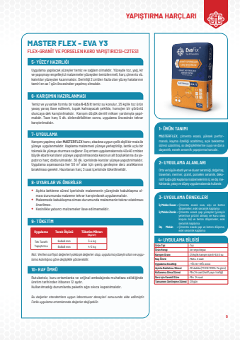 9YAPI%u015eTIRMA HAR%u00c7LARIMASTERFLEX, %u00e7imento esasl%u0131, y%u00fcksek performansl%u0131, kayma %u00f6zelli%u011fi azalt%u0131lm%u0131%u015f, a%u00e7%u0131k bekletme s%u00fcresi uzat%u0131lm%u0131%u015f, %u0131s%u0131 de%u011fi%u015fikliklerine suya ve dona dayan%u0131kl%u0131, esnek seramik yap%u0131%u015ft%u0131rma harc%u0131d%u0131r.Orta ve b%u00fcy%u00fck ebatl%u0131 yer ve duvar serami%u011fi, do%u011fal ta%u015f, traverten, mermer, granit, porselen seramik, dekoratif tu%u011fla gibi kaplama malzemelerinin i%u00e7 ve d%u0131%u015f mek%u00e2nlarda, yatay ve d%u00fc%u015fey uygulamalar%u0131nda kullan%u0131l%u0131r.%u0130%u00e7 Mek%u00e2n Duvar :%u0130%u00e7 Mek%u00e2n Zemin :D%u0131%u015f Mek%u00e2n :%u00c7imento esasl%u0131 s%u0131va, al%u00e7%u0131 ve beton d%u00f6%u015femeler, eski seramik kaplama%u00c7imento esasl%u0131 %u015fap y%u00fczeyler (y%u00fczeyin yeterince prizini almas%u0131 ve kuru olas%u0131 ko%u015fulu ile) ve beton d%u00f6%u015femeler, eski seramik kaplama%u00c7imento esasl%u0131 %u015fap ve beton d%u00f6%u015feme, eski seramik kaplama1- %u00dcR%u00dcN TANIMI2- UYGULAMA ALANLARI3- UYGULAMA %u00d6RNEKLER%u0130%u00dcr%u00fcn Tipi: Toz%u00dcr%u00fcn Rengi: Gri veya BeyazKar%u0131%u015f%u0131m Oran%u0131: 25 kg%u2019l%u0131k kar%u0131%u015f%u0131m i%u00e7in 6-6.5 lt suKap %u00d6mr%u00fc: Maks. 3 saatUygulama S%u0131cakl%u0131%u011f%u0131: +50C ile +350C aras%u0131A%u00e7%u0131kta Bekletme S%u00fcresi : 30 dakika (TS EN 12004-1%u2019e g%u00f6re)Kullan%u0131ma Alma S%u00fcresi: Min.24 saat (hafif yaya trafi%u011fi)Derz i%u00e7in Gerekli S%u00fcre: Min. 24 saat Tamamen Sertle%u015fme S%u00fcresi: 28 g%u00fcn 4- UYGULAMA B%u0130LG%u0130S%u0130 5- Y%u00dcZEY HAZIRLI%u011eI 6- KARI%u015eIMIN HAZIRLANMASI 7- UYGULAMA 8- UYARILAR VE %u00d6NER%u0130LER 9- T%u00dcKET%u0130M 10- RAF %u00d6MR%u00dcMASTER FLEX - EVA Y3FLEX-GRAN%u0130T VE PORSELEN KARO YAPI%u015eTIRICISI-C2TES1Uygulama yap%u0131lacak y%u00fczeyler temiz ve sa%u011flam olmal%u0131d%u0131r. Y%u00fczeyde toz, ya%u011f, kir ve yap%u0131%u015fmay%u0131 engelleyici malzemeler y%u00fczeyden temizlenmeli, har%u00e7 %u00e7imento vb. kal%u0131nt%u0131lar y%u00fczeyden kaz%u0131nmal%u0131d%u0131r. Derinli%u011fi 2 cm%u2019den fazla olan y%u00fczey hatalar%u0131n%u0131n tamiri en az 1 g%u00fcn %u00f6ncesinden yap%u0131lm%u0131%u015f olmal%u0131d%u0131r.Temiz ve yuvarlak formlu bir kaba 6-6.5 lt temiz su konulur, 25 kg%u2019l%u0131k toz %u00fcr%u00fcn yava%u015f yava%u015f ilave edilerek, topak kalmayacak %u015fekilde, homojen bir g%u00f6r%u00fcnt%u00fc oluncaya dek kar%u0131%u015ft%u0131r%u0131lmal%u0131d%u0131r. Kar%u0131%u015f%u0131m d%u00fc%u015f%u00fck devirli mikser yard%u0131m%u0131yla yap%u0131lmal%u0131d%u0131r. Taze har%u00e7 5 dk. dinlendirildikten sonra, uygulama %u00f6ncesinde tekrar kar%u0131%u015ft%u0131r%u0131lmal%u0131d%u0131r.Kar%u0131%u015f%u0131m%u0131 yap%u0131lm%u0131%u015f olan MASTERFLEX harc%u0131, ebad%u0131na uygun %u00e7elik di%u015fili bir mala ile y%u00fczeye uygulanmal%u0131d%u0131r. Kaplama malzemesi y%u00fczeye yerle%u015ftirilip, lastik u%u00e7lu bir tokmak ile y%u00fczeye oturmas%u0131 sa%u011flan%u0131r. D%u0131%u015f ortam uygulamalar%u0131nda 40x40 cm%u2019den b%u00fcy%u00fck ebatl%u0131 karolar%u0131n y%u00fczeye yap%u0131%u015ft%u0131r%u0131lmas%u0131nda karonun alt bo%u015fluklar%u0131na da yap%u0131%u015ft%u0131r%u0131c%u0131 har%u00e7 doldurulmal%u0131d%u0131r. 30 dk. i%u00e7erisinde karolar y%u00fczeye yap%u0131%u015ft%u0131r%u0131lmal%u0131d%u0131r. Uygulama a%u015famas%u0131nda her 50 m%u00b2 alan i%u00e7in geni%u015f genle%u015fme derz aral%u0131klar%u0131n%u0131n b%u0131rak%u0131lmas%u0131 gerekir. Haz%u0131rlanan har%u00e7 3 saat i%u00e7erisinde t%u00fcketilmelidir.Rutubetsiz, kuru ortamlarda ve orijinal ambalaj%u0131nda muhafaza edildi%u011finde %u00fcretim tarihinden itibaren 12 ayd%u0131r.Kullan%u0131lmad%u0131%u011f%u0131 durumlarda paketin a%u011fz%u0131 s%u0131k%u0131ca kapat%u0131lmal%u0131d%u0131r. %u2022A%u00e7%u0131kta bekleme s%u00fcresi i%u00e7erisinde malzemenin y%u00fczeyinde kabukla%u015fma olmas%u0131 durumunda malzeme tekrar kar%u0131%u015ft%u0131r%u0131larak uygulanmal%u0131d%u0131r.%u2022Malzemede kabukla%u015fma olmas%u0131 durumunda malzemenin tekrar %u0131slat%u0131lmas%u0131 %u00f6nerilmez.%u2022Kesinlikle yabanc%u0131 malzemeler ilave edilmemelidir.UygulamaTarak %u00d6l%u00e7%u00fcs%u00fcT%u00fcketim Miktar%u0131(Kg/m2)Tek Tarafl%u0131Yap%u0131%u015ft%u0131rma6x6x6 mm3-4 kg8x8x8 mm4-5 kgBu de%u011ferler standartlara uygun laboratuvar deneyleri sonucunda elde edilmi%u015ftir. Farkl%u0131 uygulama ortamlar%u0131nda de%u011ferler de%u011fi%u015febilir.Not: Verilen sarfiyat de%u011ferleri yakla%u015f%u0131k de%u011ferler olup, uygulama y%u00fczeyin alan%u0131 ve uygulama kal%u0131nl%u0131%u011f%u0131na g%u00f6re de%u011fi%u015fiklik g%u00f6sterebilir.
